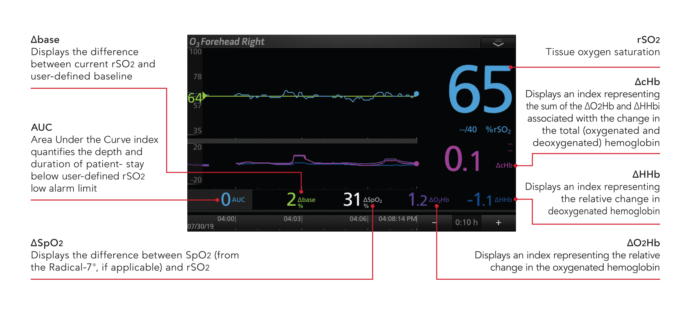 Le système O3 surveille régionalement la saturation en oxygène de l'hémoglobine dans le sang (rSO2) dans les régions cérébrales et somatiques pour toutes les populations de patients. En fournissant des informations supplémentaires sur les changements de saturation en oxygène des tissus, le système O3 peut aider les cliniciens à surveiller l'oxygénation régionale lorsque l'oxymétrie du pouls seule ne permet pas d'évaluer pleinement l'état d'oxygénation dans une région donnée.