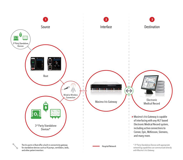 With the addition of noninvasive blood pressure and temperature to the Root platform, clinicians can easily and automatically chart vital signs data directly from Root. Enhancing the solution with Masimo Patient SafetyNet™ allows data to be sent directly to the patient's electronic medical record (EMR) while alarms and alerts are seamlessly forwarded to the patient's clinician.