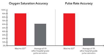 Masimo SET® includes measurement of oxygen saturation (SpO2), pulse rate (PR), perfusion index (Pi), and PVi®, a measure of the dynamic changes in PI that occur during the respiratory cycle. Masimo SET® addresses the challenges of low perfusion and motion artifact that limit conventional pulse oximetry by harnessing the power of adaptive filters to reduce measurement inaccuracy. Masimo SET® helps clinicians monitor more than 100 million patients a year2 and is used by 8 of the top 10 hospitals listed in the 2016-17 U.S. News and World Report Best Hospitals Honor Roll.3