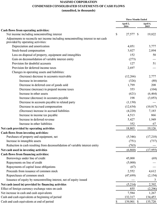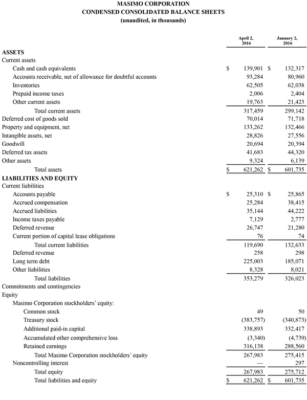 As the result of anticipated legal fee savings during the fourth fiscal quarter, Masimo now expects its fiscal 2016 GAAP earnings per diluted share, exclusive of the impact of the business partnership agreement, to be $2.14, up from $2.13. Masimo expects to use some of the after-tax proceeds from the business partnership agreement to repay amounts outstanding under its revolving line of credit. The guidance set forth above is an estimate only and actual performance could differ.