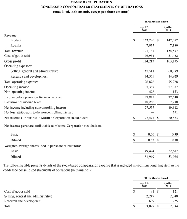 This press release includes forward-looking statements as defined in Section 27A of the Securities Act of 1933 and Section 21E of the Securities Exchange Act of 1934, in connection with the Private Securities Litigation Reform Act of 1995. These forward-looking statements are based on current expectations about future events affecting us and are subject to risks and uncertainties, all of which are difficult to predict and many of which are beyond our control and could cause our actual results to differ materially and adversely from those expressed in our forward-looking statements as a result of various risk factors, including, but not limited to: risks related to our belief that Masimo's unique noninvasive measurement technologies contribute to positive clinical outcomes and patient safety; risks related to our belief that Masimo noninvasive medical breakthroughs provide cost-effective solutions with comparable accuracy and unique advantages; as well as other factors discussed in the "Risk Factors" section of our most recent reports filed with the Securities and Exchange Commission ("SEC"), which may be obtained for free at the SEC's website at www.sec.gov. Although we believe that the expectations reflected in our forward-looking statements are reasonable, we do not know whether our expectations will prove correct. All forward-looking statements included in this press release are expressly qualified in their entirety by the foregoing cautionary statements. You are cautioned not to place undue reliance on these forward-looking statements, which speak only as of today's date. We do not undertake any obligation to update, amend or clarify these statements or the "Risk Factors" contained in our most recent reports filed with the SEC, whether as a result of new information, future events or otherwise, except as may be required under the applicable securities laws.